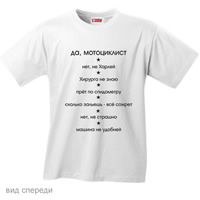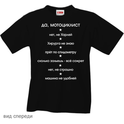 « Вернуться к выбору Футболка "Да, мотоциклист" новинка!     Качество текстиля: плотность 180 грамм, 100% хлопок, двойные строчки на горловине, рукавах и внизу футболки