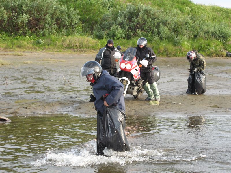 кстати, там на фотке видно колесо от трактора чтоль в воде валяется. вот когда все переправились, колесо уже было скрыто под водой. так что вовремя успели. Пассажирки традиционно все препятствие переходят пешком. Почему то не догадались купить ОЗКшные бахилы и для них, хоть цена им 200 рублей, зато догадались купить пачку пакетов для мусора. так и жили:)