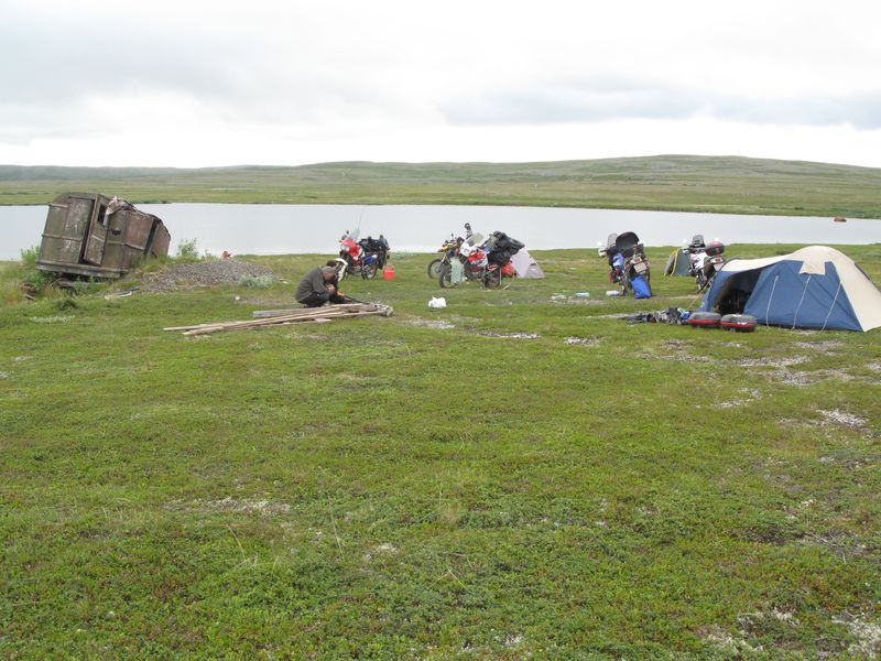 У Мурманских байкеров все схвачено. Свои люди есть и на монтаже, так что наших товарищей переобули качественно и быстро. Вообще, тамошние мотолюди - совершщенно самоотверженные и фанатично преданные своему делу люди. Сезон у них продолжается всего 2 месяца, и за них надо успеть накатаца на год вперед. ТЕмпература, ктстаи, нифига не летняя. Днем - не выше 15, ночью - около 4-8.. Чуваки жгут каждую ночь, потому что времени мало!