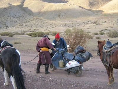 В начале перевала меня нагнали два пастуха на конях. Я остановился, они тоже спешились и стали ходить вокруг скута, трогать, цокать языками. Потом старший ускакал к юртам, а молодой еще долго ехал впереди меня и пел заунывную монгольскую песню. Сцена была прикомическая: белый человек, обливаясь потом, толкает в гору одно из достижений конца ХХ-го века, а полу-дикий монгол рядом едет на коне и поет песню.
